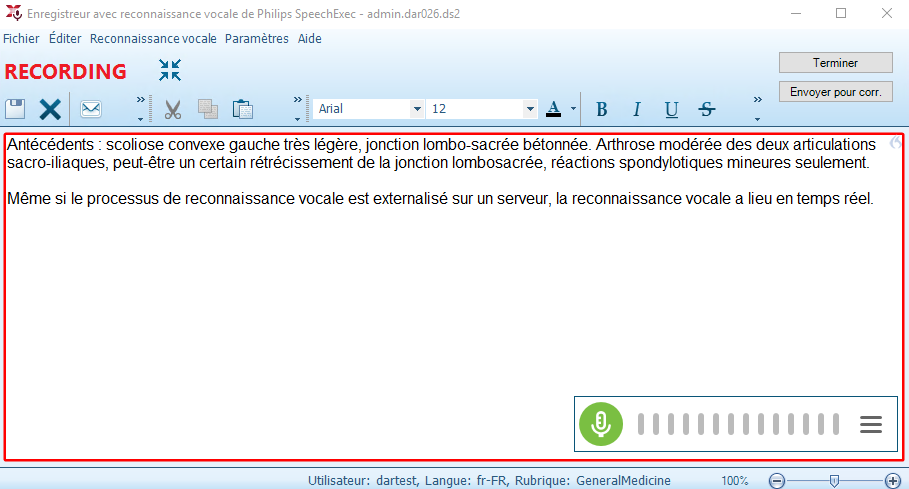 - En plus du texte reconnu par la voix, le fichier audio original est également envoyé au secrétariat pour faciliter la correction de la dictée par les transcripteurs médicaux.